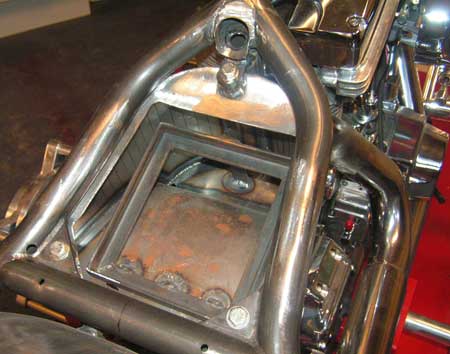 Fejkad oljetank, plats för batteriet. Lägg märke till hål i ramen för el-ledningarna